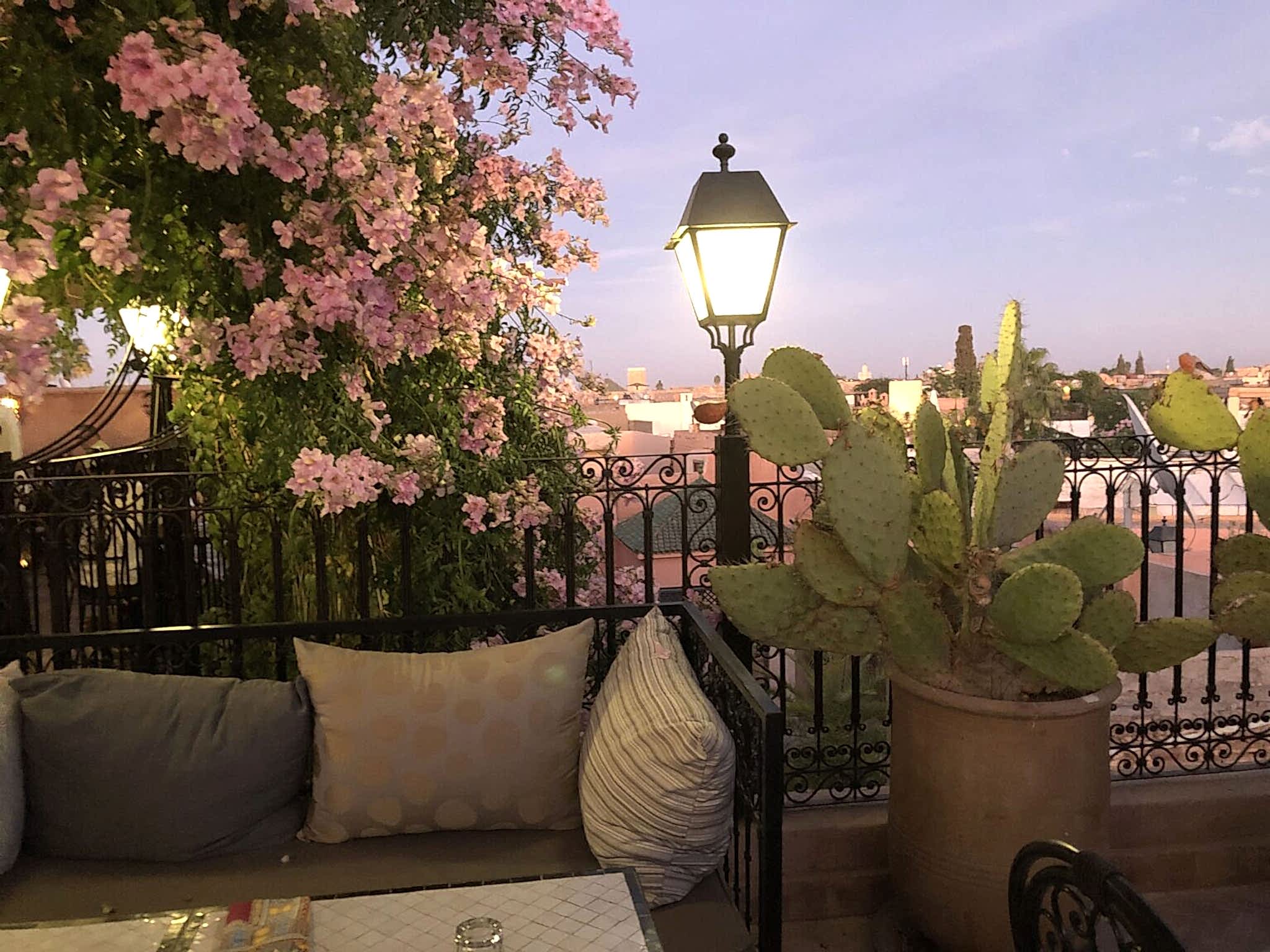 Terrasse enchanteresse à Marrakech, vue panoramique sur la Médina, idéale pour dîner au coucher du soleil ou siroter des cocktails sous les étoiles. Une expérience à savourer pleinement !